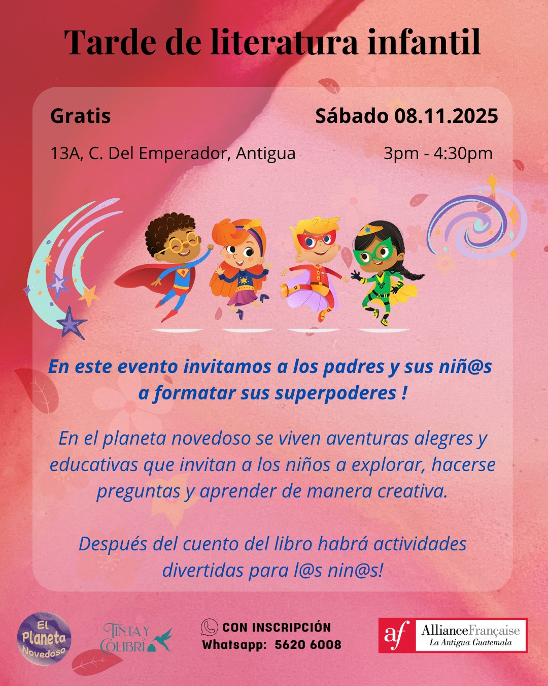 En la Alianza Francesa de La Antigua El evento invita a padres y niñ@s a descubrir sus "superpoderes" a través de cuentos y actividades creativas que fomentan la exploración, el aprendizaje y la diversión en un ambiente educativo y alegre.