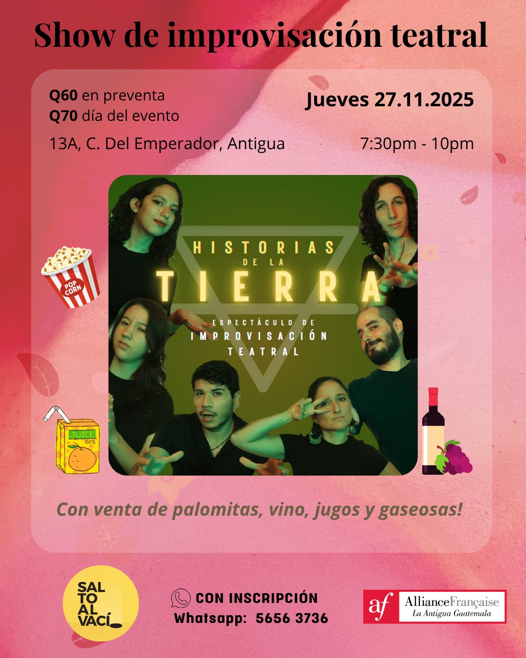 En la Alianza Francesa de la Antigua Ven a disfrutar del espectáculo de improvisación teatral "Historias de la Tierra" de Salto del Vacío.